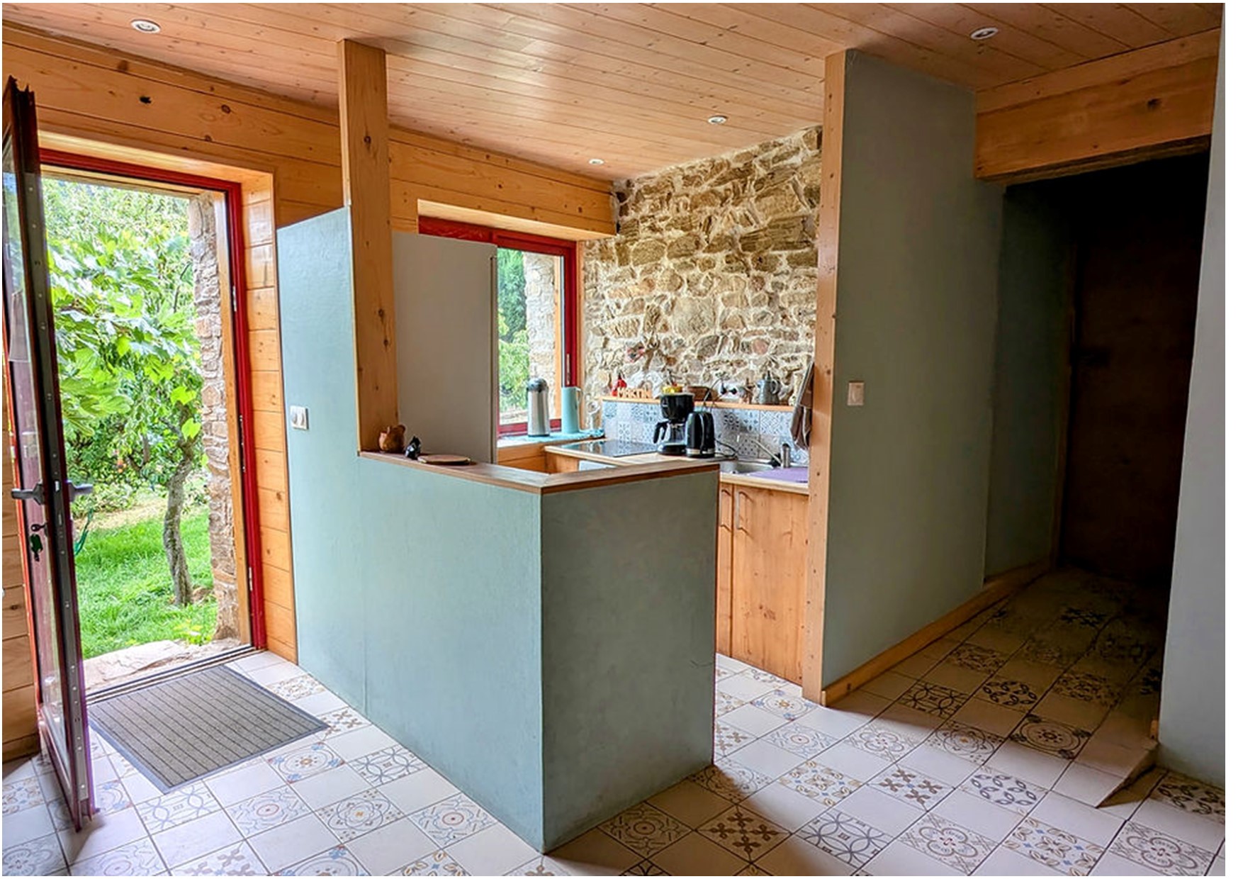 Un espace cuisine avec évier, un réfrigérateur, une table de cuisson, un four, un lave-vaisselle, ainsi qu'une bouilloire et une cafetière électrique. Nous proposons aussi la vaisselle à la location pour 30 personnes.
